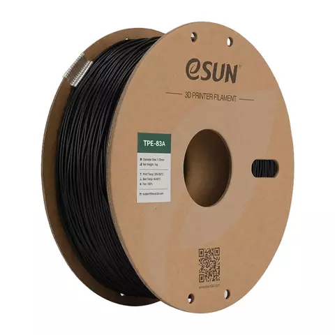 eSUN Elastic TPE-83A — эластичный филамент с твердостью 83 по шкале Шора (А), заметно мягче стандартных TPU-95A. Поверхность материала отличается низким коэффициентом трения и приятным на ощупь «матовым» эффектом, при этом сохраняет усиленную прочность, долговечность напечатанных изделий и приближенную к резине гибкость. TPE-83A предназначен для 3D-печати предметов, работающих на изгиб, растяжение или сжатие.