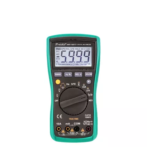 Pro'sKit MT-1217 – это цифровой 3 5/6-разрядный True RMS мультиметр, оснащенный ЖК-дисплеем с высотой текста 20 мм. Модель отличается четкостью показаний, стабильной работой и высокой надежностью. Мультиметр предназначен для измерения постоянного и переменного напряжения, постоянного и переменного тока, сопротивления, емкости, частоты/коэффициента заполнения, бесконтактного определения напряжения, проверки диодов и прозвонки цепи.