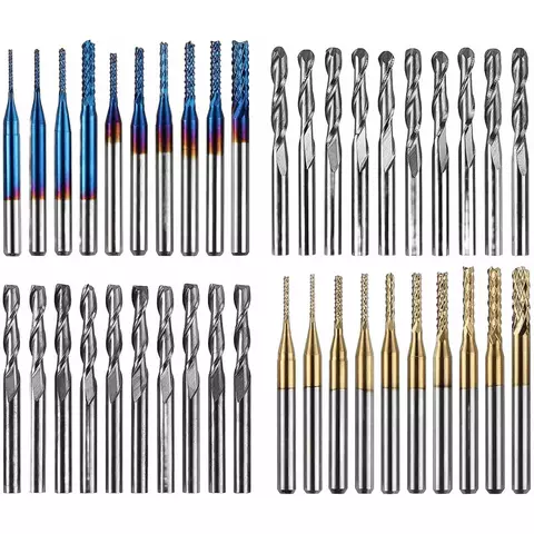 Набор содержит 40 твердосплавных фрез для обработки широкого спектра материалов: дерева, MDF, акрила, пластика, ПВХ, композитов, пресс-форм, печатных плат и других точных деталей.