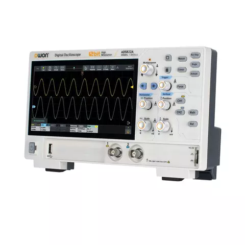 OWON ADS822A – це двоканальний цифровий осцилограф зі смугою пропускання 200 МГц, максимальною частотою дискретизації 1,25 Гвиб/с та швидкістю захоплення осцилограм 700 000 осц/с. Також прилад оснащений вбудованим частотоміром, вольтметром та аналізатором спектра ШПФ.