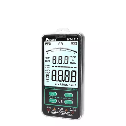 Pro'sKit MT-1510 – це кишеньковий розумний мультиметр. Модель вирізняється стабільною роботою, високою точністю, низьким енергоспоживанням, сучасним дизайном, безпекою та надійністю. Це ідеальний прилад для більшості вимірювальних завдань. Прилад може автоматично вимірювати постійну та змінну напругу, опір, провідність, постійний та змінний струм; а також у ручному режимі вимірювати ємність, температуру та тестувати діоди. Крім того, він оснащений безконтактним визначенням напруги (NCV).