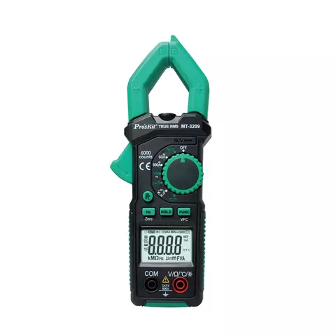 Pro'sKit MT-3209 – це цифрові True RMS струмовимірювальні кліщі з дисплеєм на 6000 відліків для точного вимірювання постійного та змінного струму та напруги, оснащені режимом LoZ для зменшення перешкод, перетворювачем напруга-частота (VFC) та функцією безконтактного виявлення напруги (NCV). Прилад забезпечує стабільні результати у побутових та професійних завданнях, зокрема, при тестуванні частоти, опору, ємності та температури.